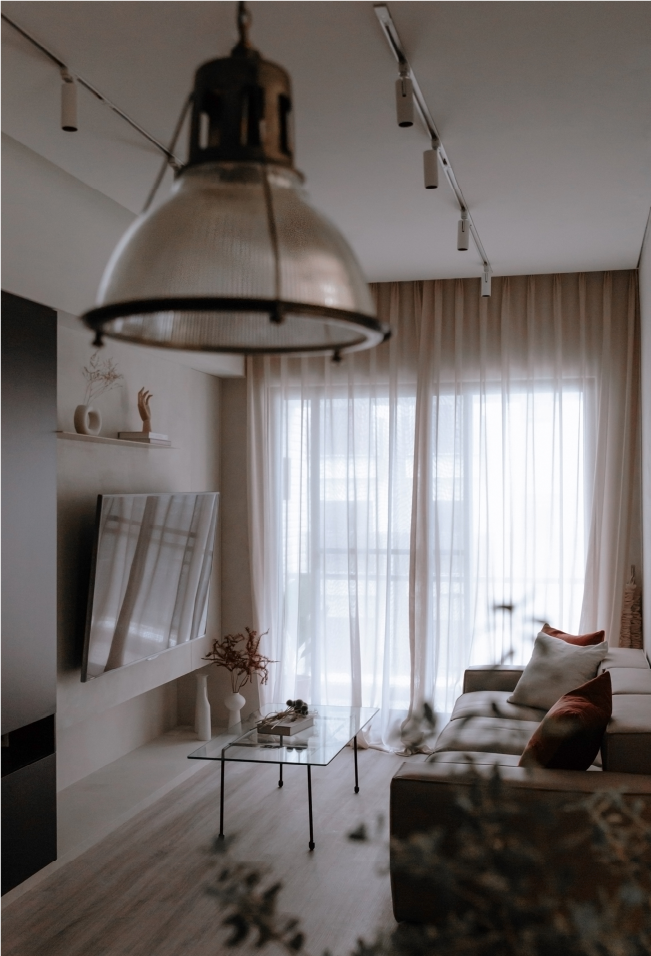 The seamless transition between the dining and living areas fosters openness and connection, allowing the spaces to breathe as one. Low-saturation furniture and carefully curated décor create a layered yet uncluttered aesthetic, where simplicity is infused with warmth and quiet elegance.